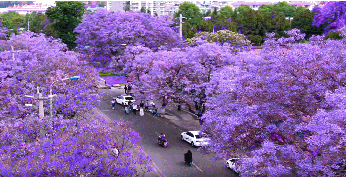 马路上、街谈旁、湖畔、小区里、三街六巷,都被盛放的蓝花楹包围,演绎满城的紫色放荡。