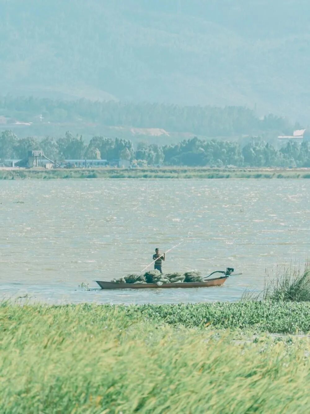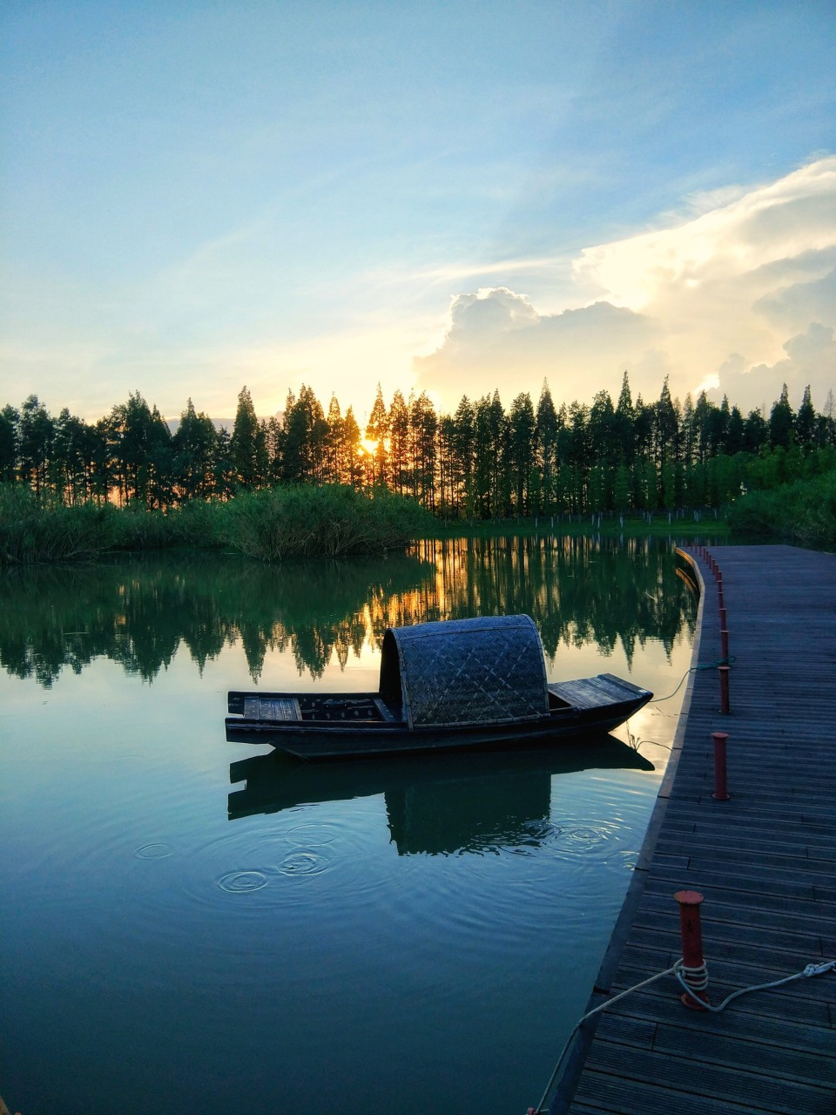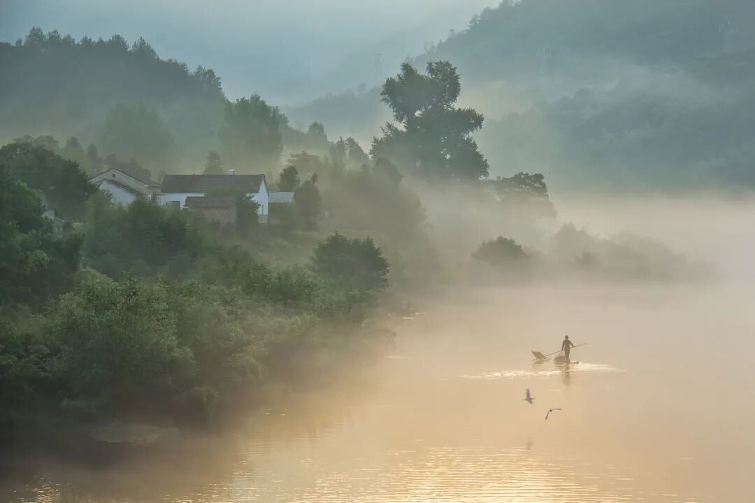 一场淅淅沥沥的春雨后,空气中都是土壤的芬芳,一艘划子泛舟江中,折成一幅自在的水墨画卷。