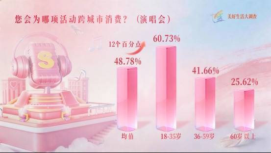 r手脚体验耗尽的主力军,35岁以下的年青女性把喜爱写进耗尽清单,她们在文娱耗尽上的插足高于其他年事段。数据见证偏疼,她们对“演唱会”的耗尽关心极高,她们中有多达60.73%的东说念主自得为一场中意的演唱会来一场说走就走的跨城耗尽,比全年事段平均水平突出12个百分点!奔赴现场的狂欢,感受旋律里的心绪共识,这是她们最成功的情愿抒发。