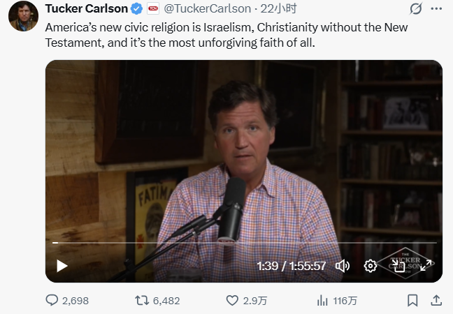 他在配文中写谈:“好意思国的新公民宗教是‘以色列方针’,是莫得《新约圣经》的基督教,这是通盘信仰中最冷凌弃的。”