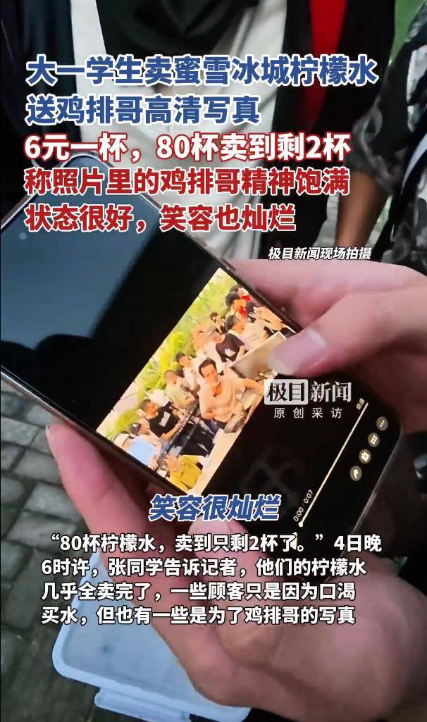 所谓的“高清写照”,实则是学生们现场霸占视角拍摄的3张鸡排哥职责照和1段视频素材,被描画为展现了其“元气心灵蓬勃、笑脸灿烂”的一忽儿。顾主购买柠檬水后,通过微信选定相片;即便不买,也能免费赢得这份“粉丝福利”。这一招居然顺利,80杯柠檬水最终售出78杯,近乎清仓。部分顾主是为解渴刚需买单,而另一部分则坦言便是冲着“鸡排哥写照”下的单。