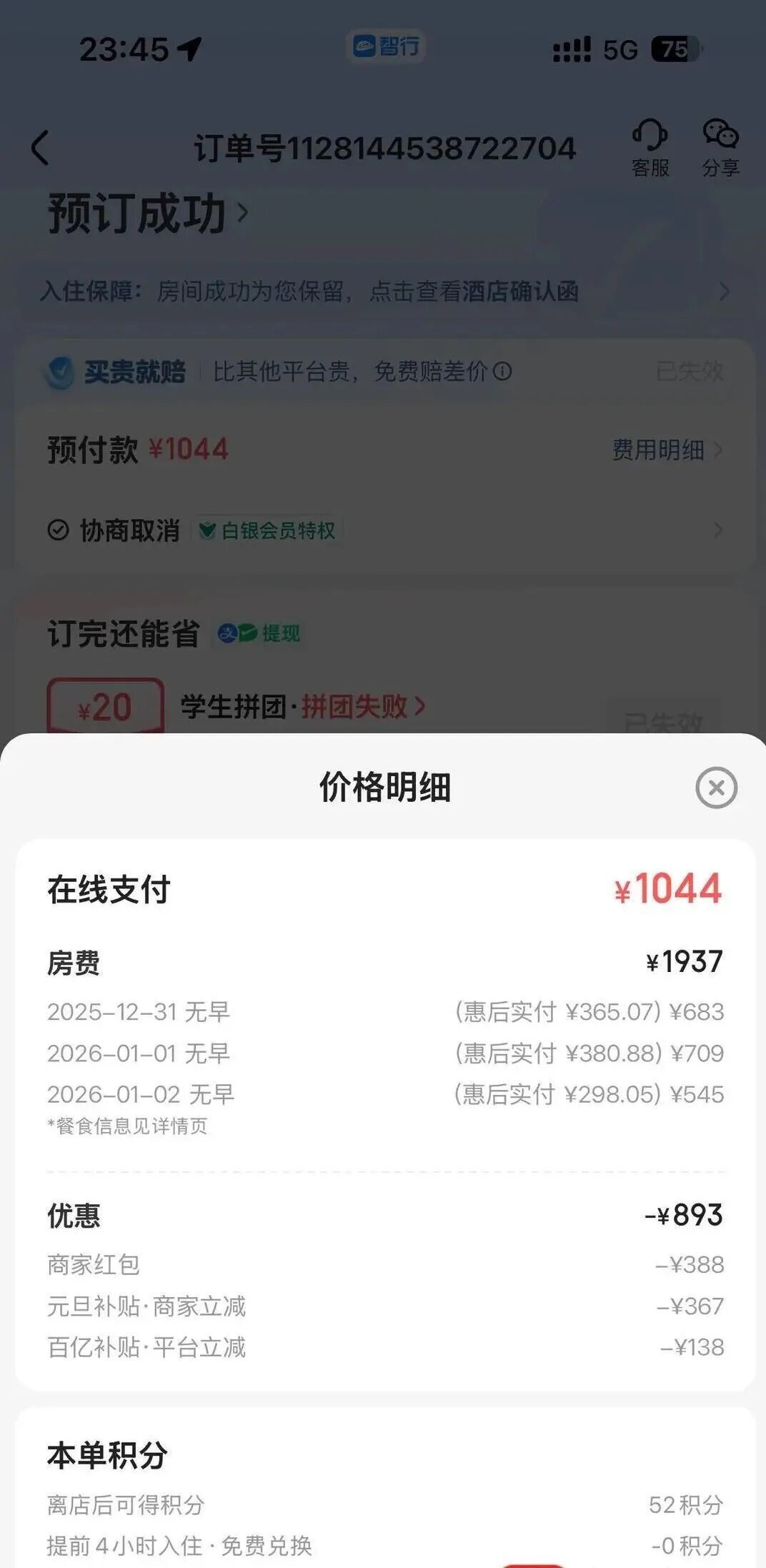张女士的酒店订单截图